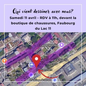 On se retrouve le samedi 11 avril 2026 devant la boutique de chaussures, Faubourg du Lac 11, 2000 Neuchâtel pour notre rendez-vous mensuel d’Urban Sketching.